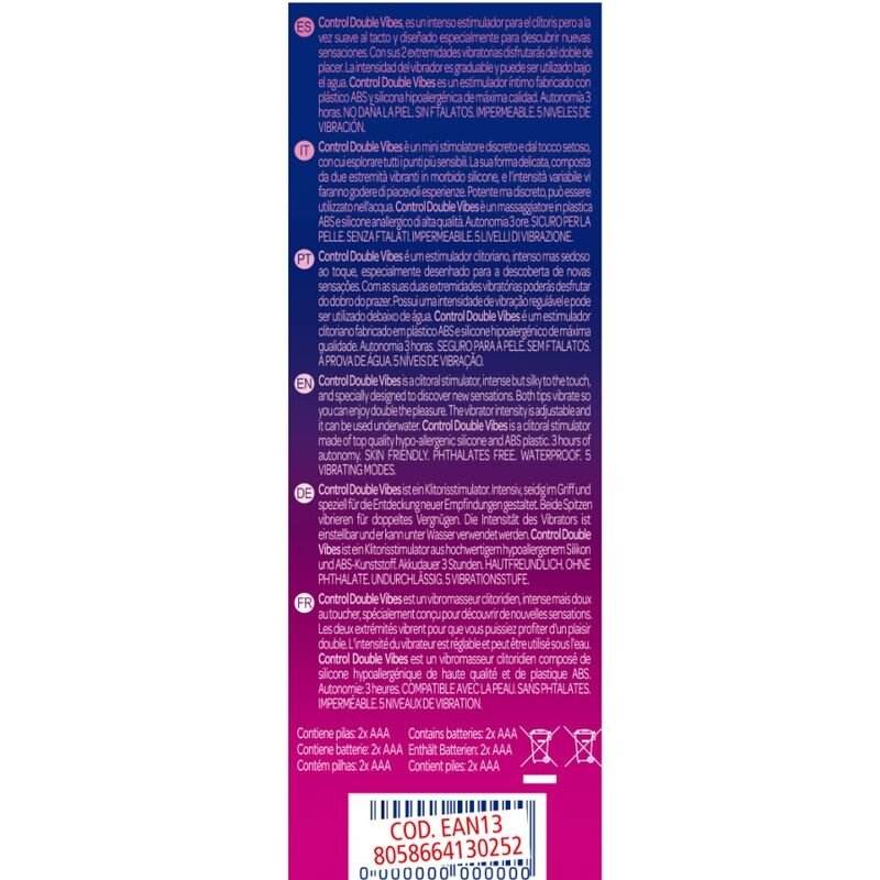 With its 2 vibrating limbs you will enjoy double the pleasure. The intensity of the vibrator is adjustable and can be used underwater. Control Double Vibes is an intimate stimulator made with ABS plastic and the highest quality hypoallergenic silicone.