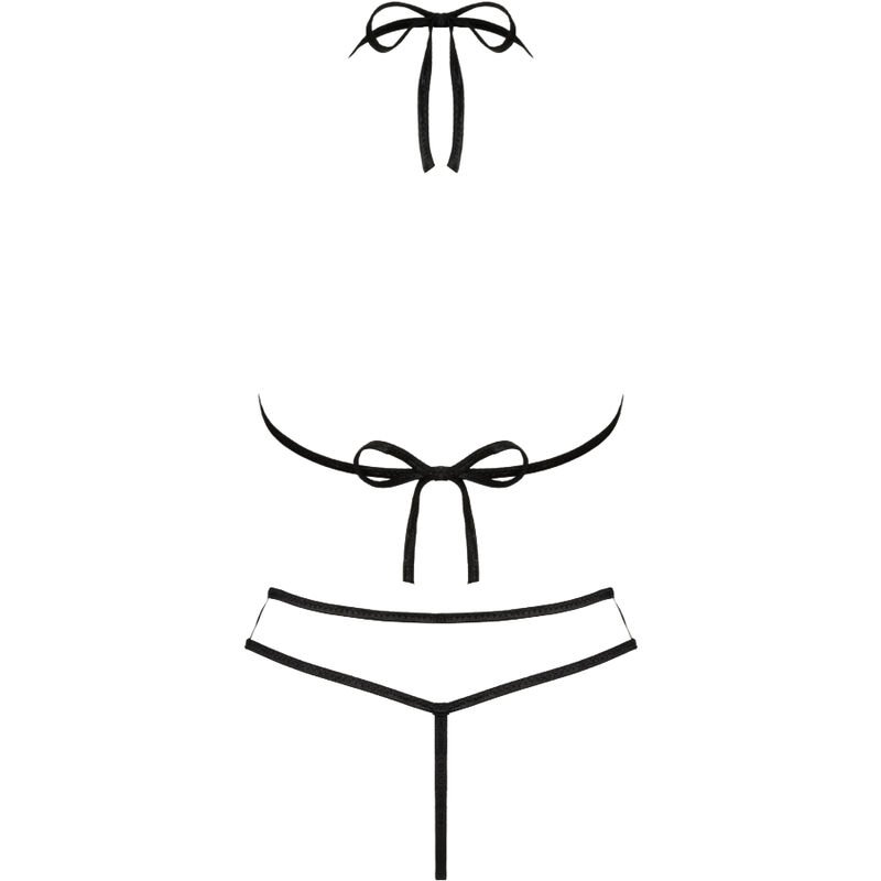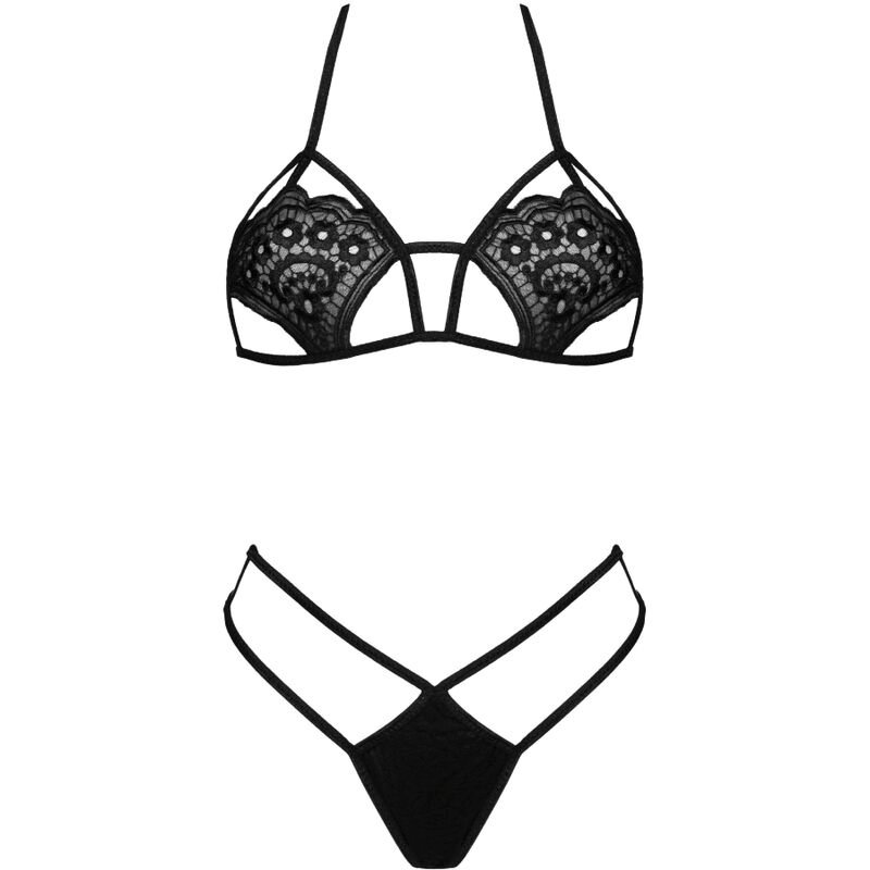 Jimenas unusual and spicy set consists of a bra and matching thong. The black straps further accentuate her seductive character.