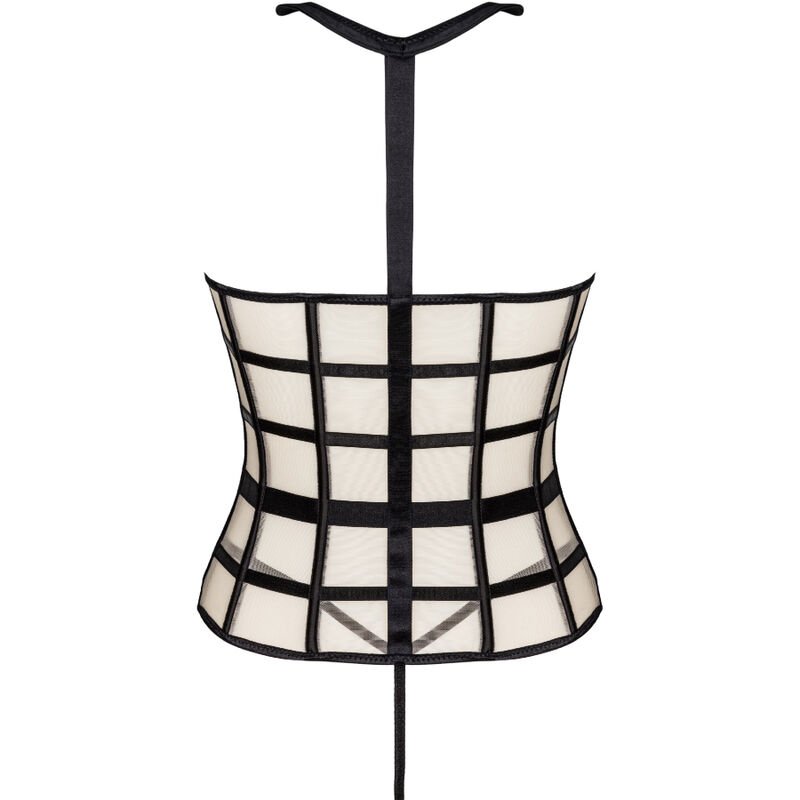 A two-piece set consisting of a sensual, busty corset and a sexy black thong. The corset has a zipper at the front, making it easy to put on. The colors of the set are black and beige, which together create an attractive combination. It is also worth paying attention to tempting details such as a black collar or black belts arranged in such a way as to best highlight the waist. What stands out most about this corset are the cutouts that expose the bust. This makes the whole set very daring and provocative. Not much is left to the imagination. Nipple stickers will be a great addition to the game and add some spice.